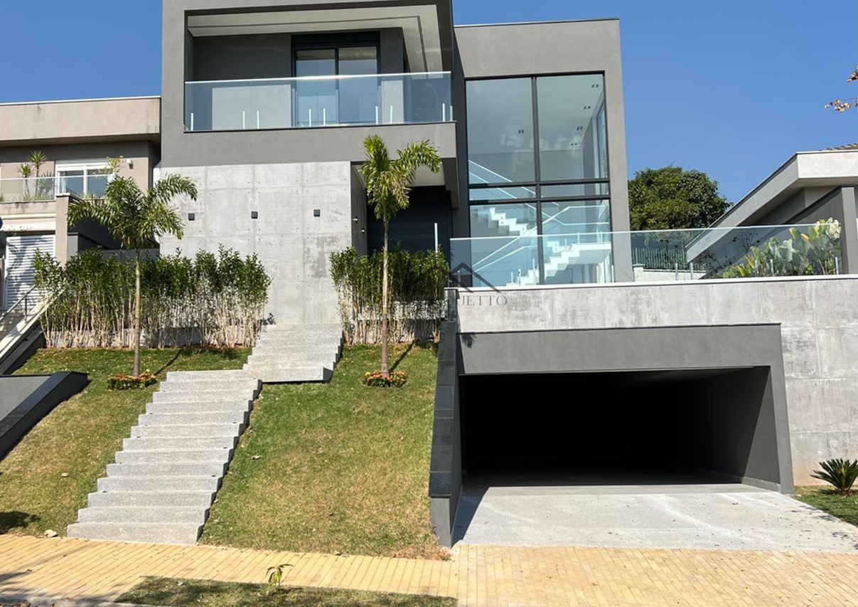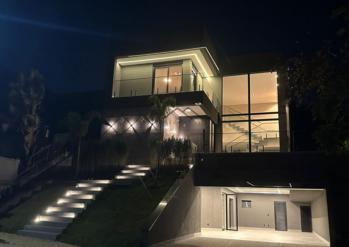 Projeto imponente, com living envidraçado de 6m de pé direito, integrado à área gourmet e sala de jantar. São 4 suítes, sendo a master com dois chuveiros e banheira de imersão. Ambientes com ar-condicionado e móveis planejados de alto padrão.