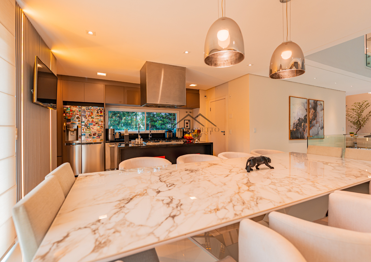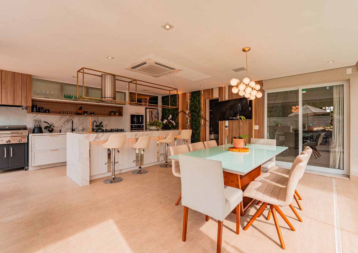 Área social integrada com living, jantar e sala de estar