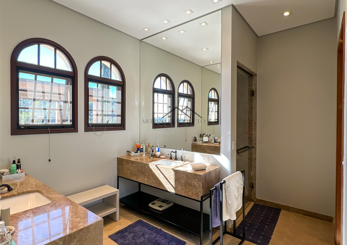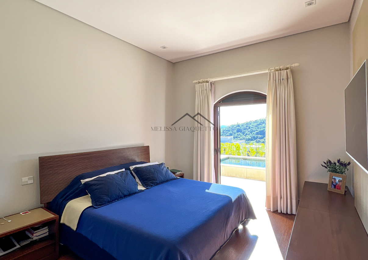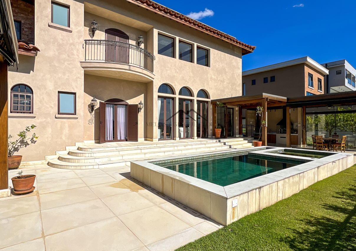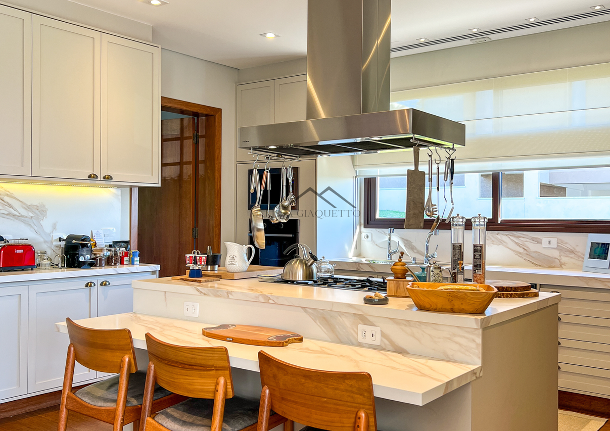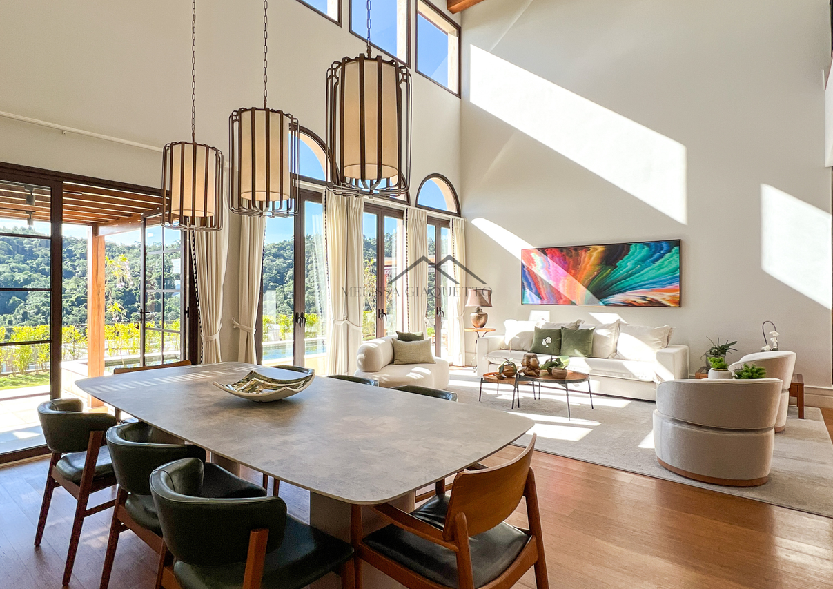 Conta com 5 suítes, sendo 2 no térreo, todas com closet, incluindo suíte máster com 2 closets exclusivos. O living e a sala de jantar possuem pé-direito duplo, proporcionando amplitude e luminosidade. Destaque para a adega climatizada para até 370 garrafas, cozinha gourmet integrada e cozinha de apoio.