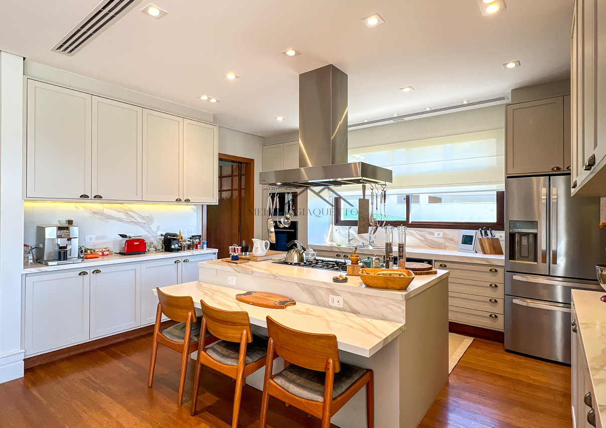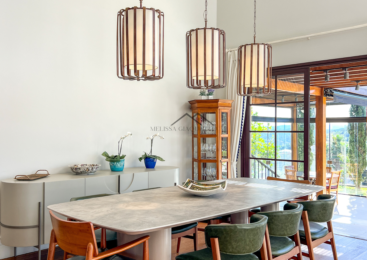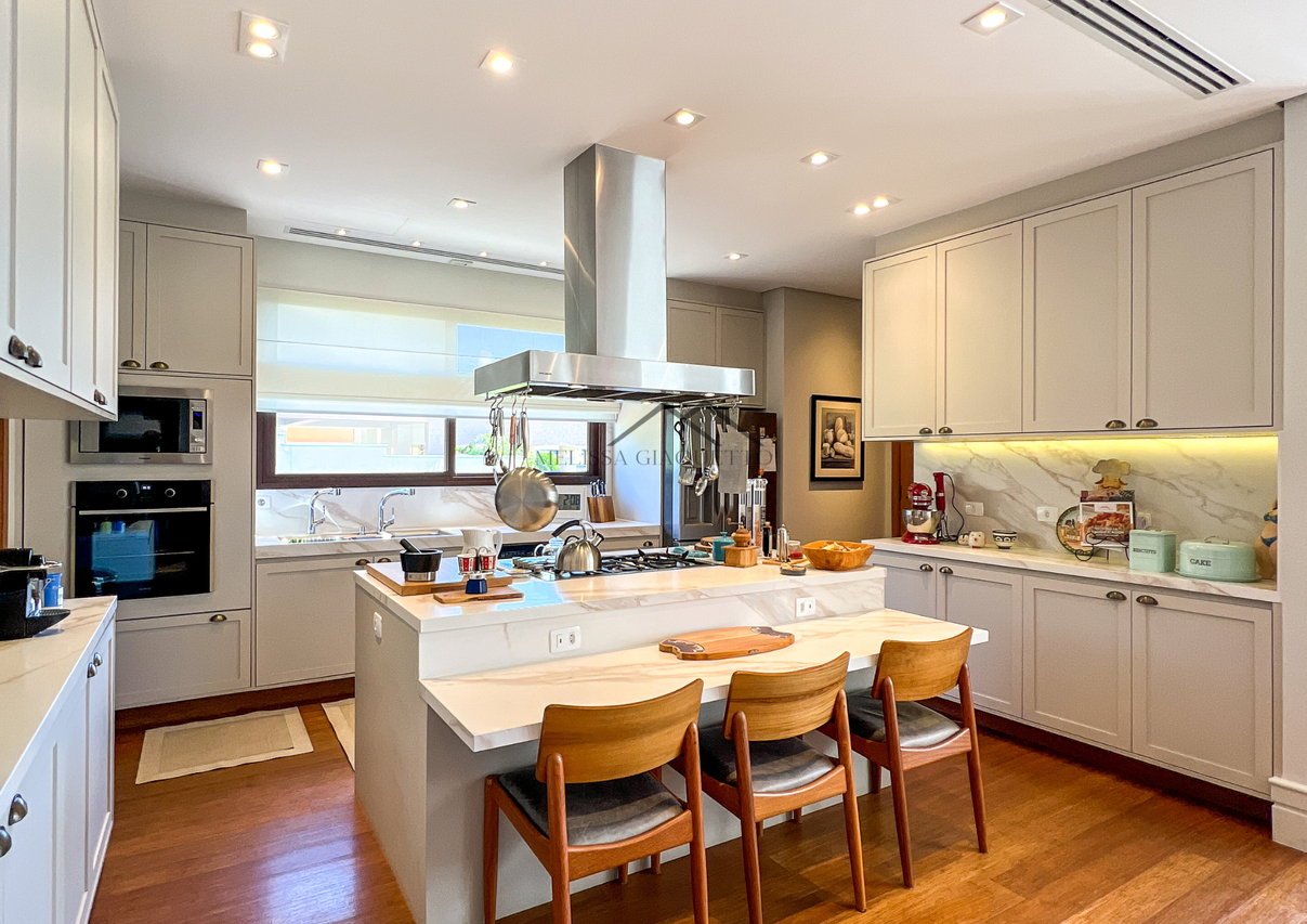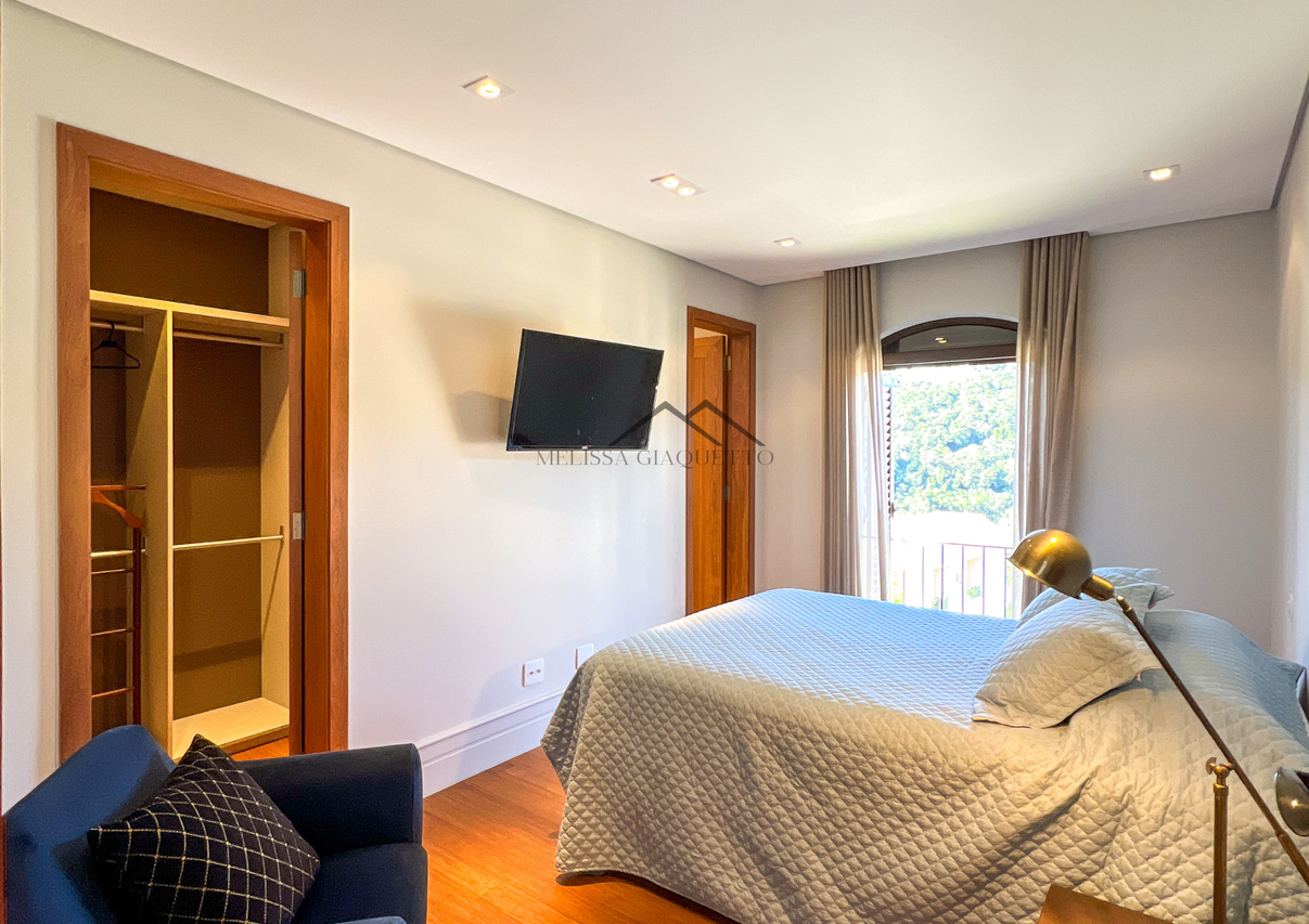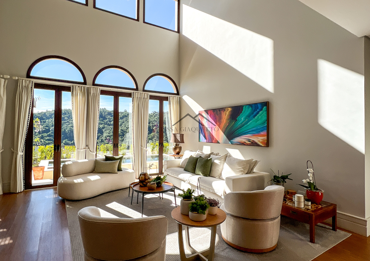 Conta com 5 suítes, sendo 2 no térreo, todas com closet, incluindo suíte máster com 2 closets exclusivos. O living e a sala de jantar possuem pé-direito duplo, proporcionando amplitude e luminosidade. Destaque para a adega climatizada para até 370 garrafas, cozinha gourmet integrada e cozinha de apoio.