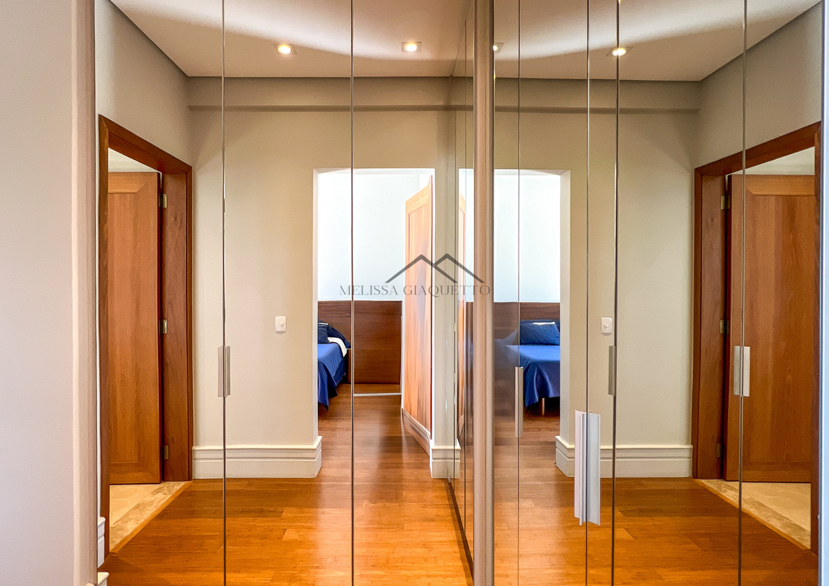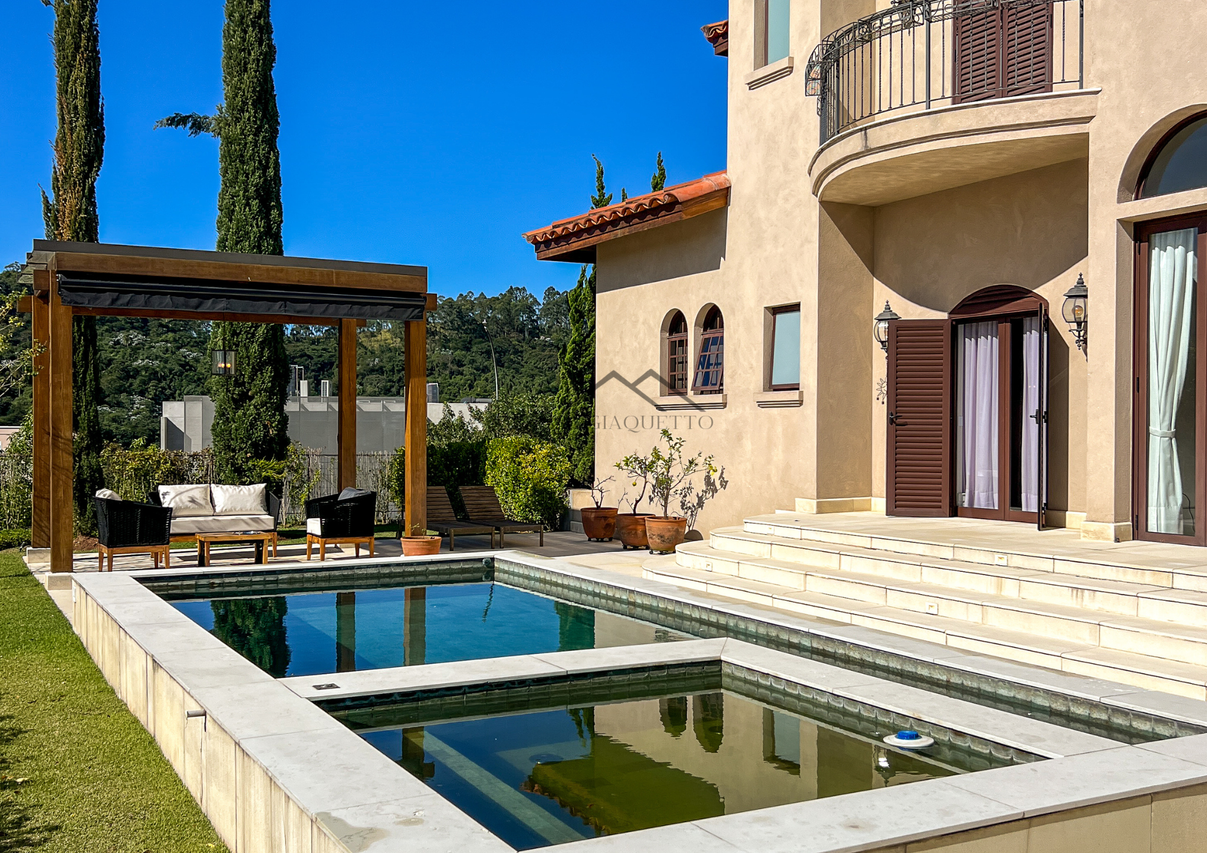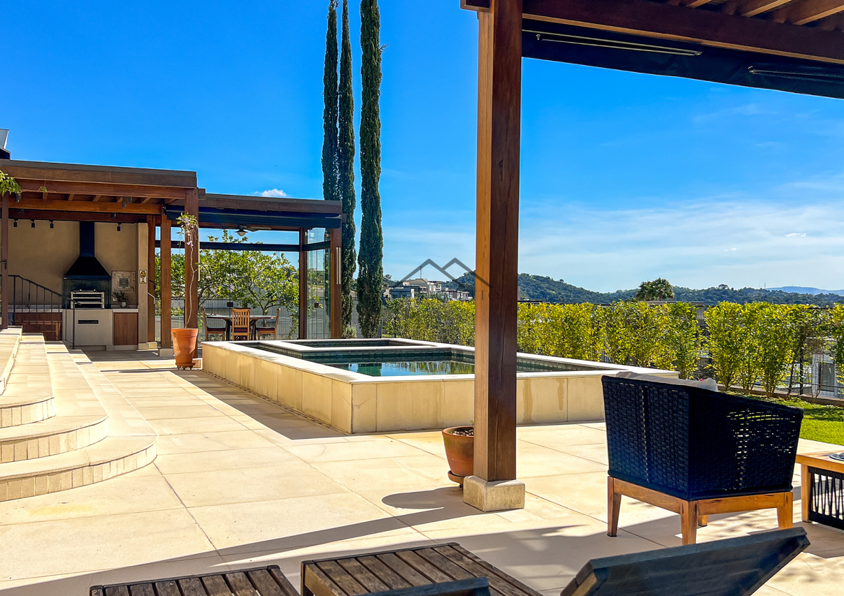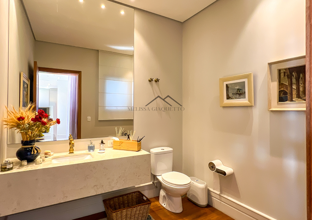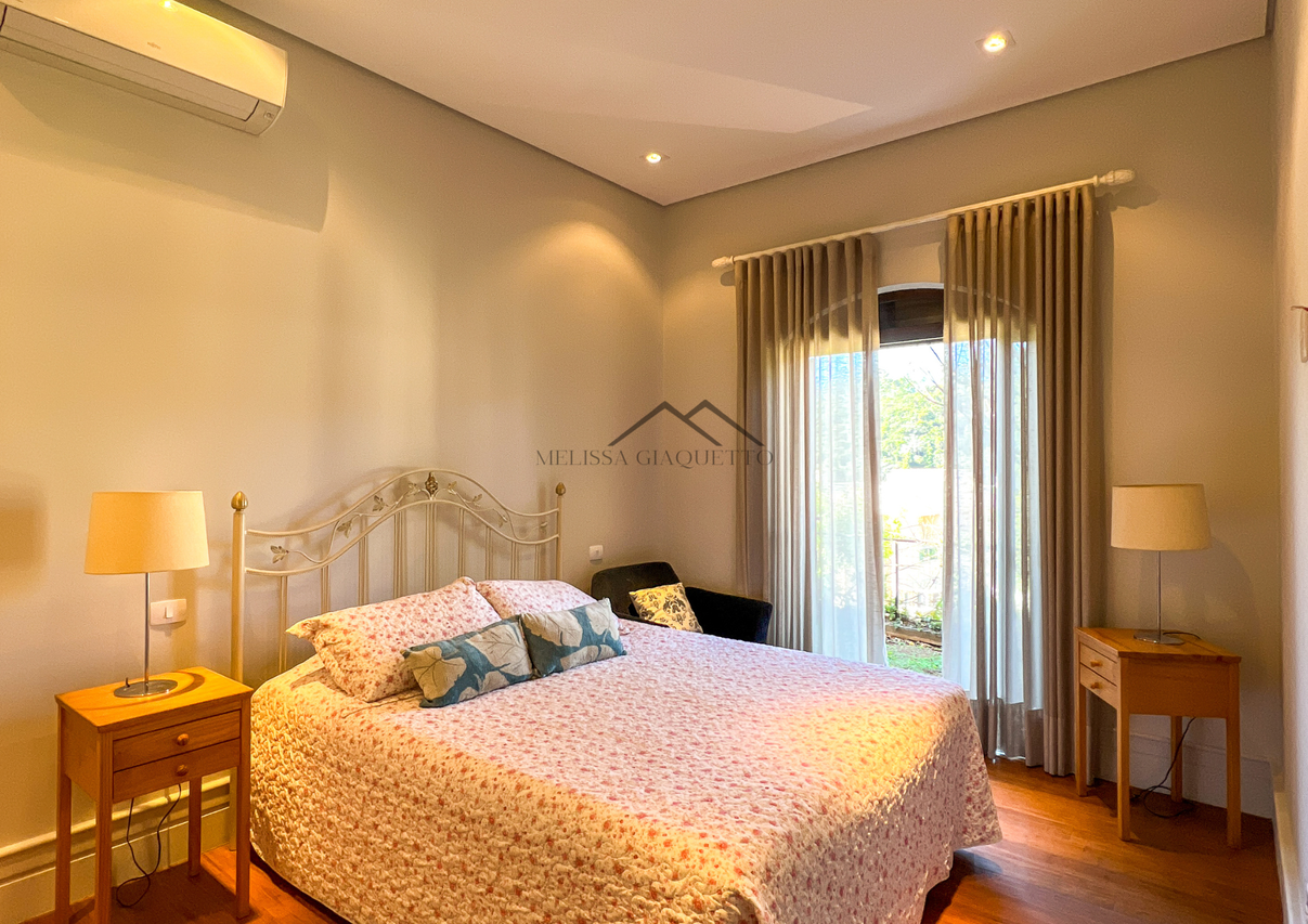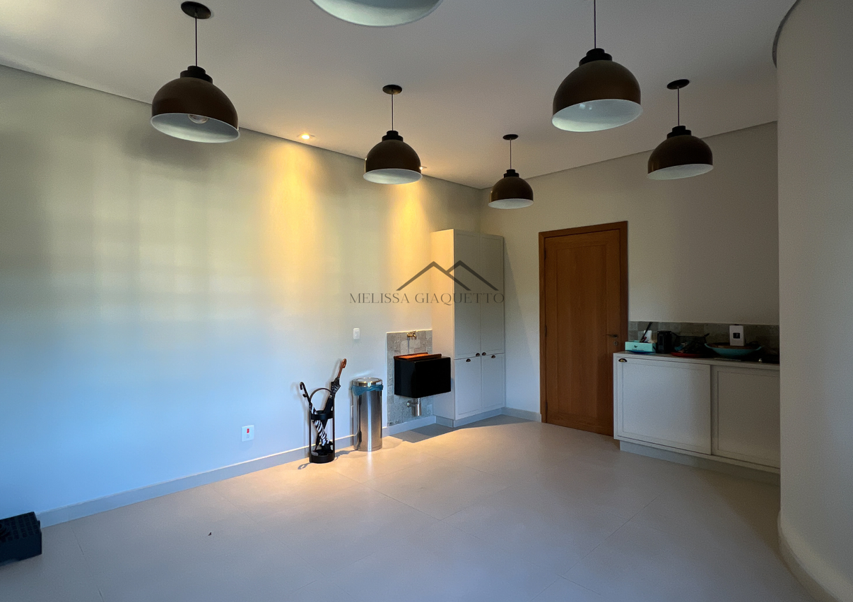 Conta com 5 suítes, sendo 2 no térreo, todas com closet, incluindo suíte máster com 2 closets exclusivos. O living e a sala de jantar possuem pé-direito duplo, proporcionando amplitude e luminosidade. Destaque para a adega climatizada para até 370 garrafas, cozinha gourmet integrada e cozinha de apoio.