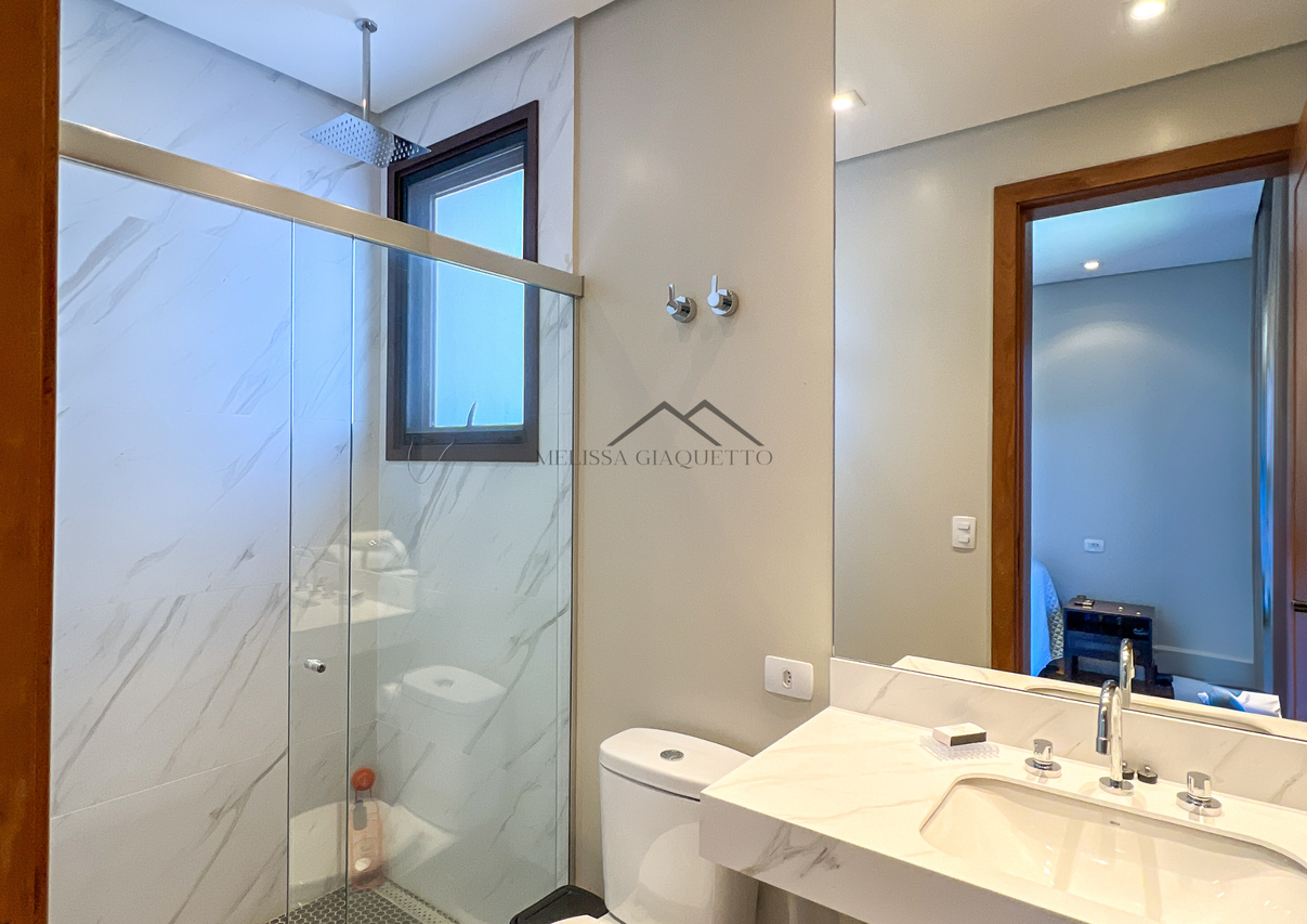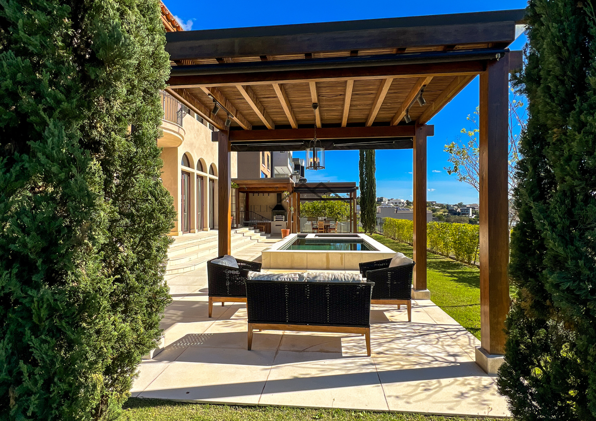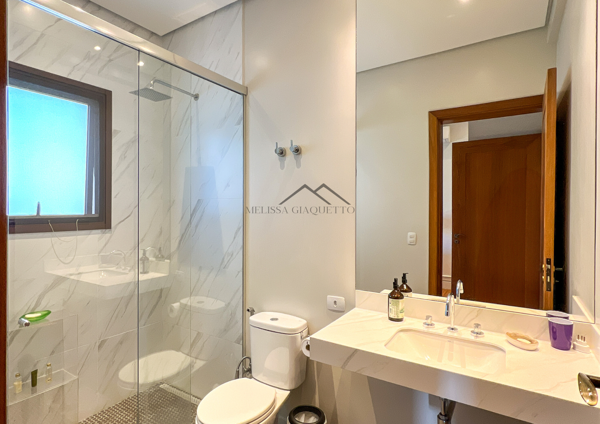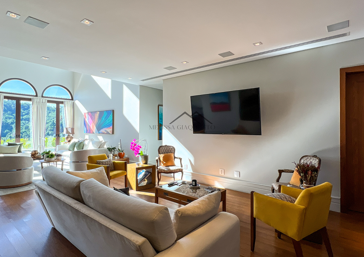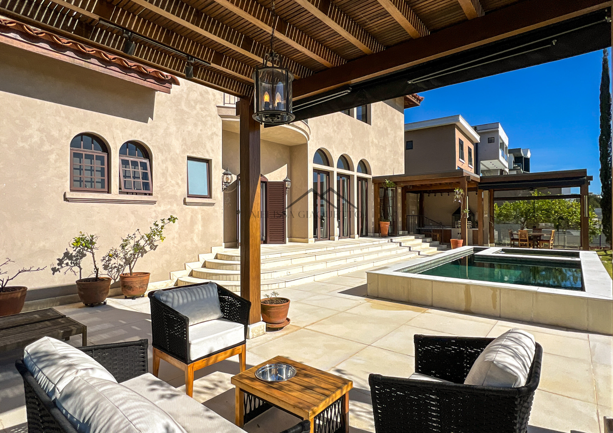 Conta com 5 suítes, sendo 2 no térreo, todas com closet, incluindo suíte máster com 2 closets exclusivos. O living e a sala de jantar possuem pé-direito duplo, proporcionando amplitude e luminosidade. Destaque para a adega climatizada para até 370 garrafas, cozinha gourmet integrada e cozinha de apoio.