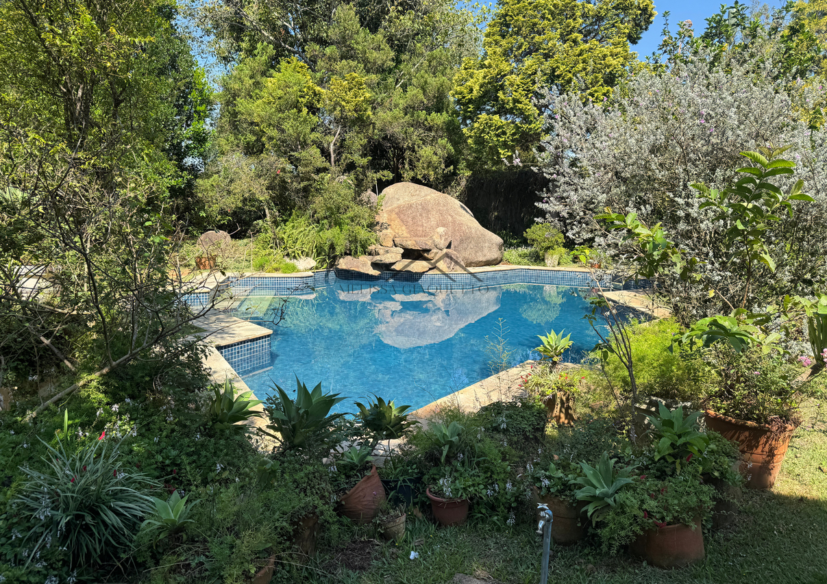Piscina com pedras naturais integrada ao jardim, em cenário de total privacidade