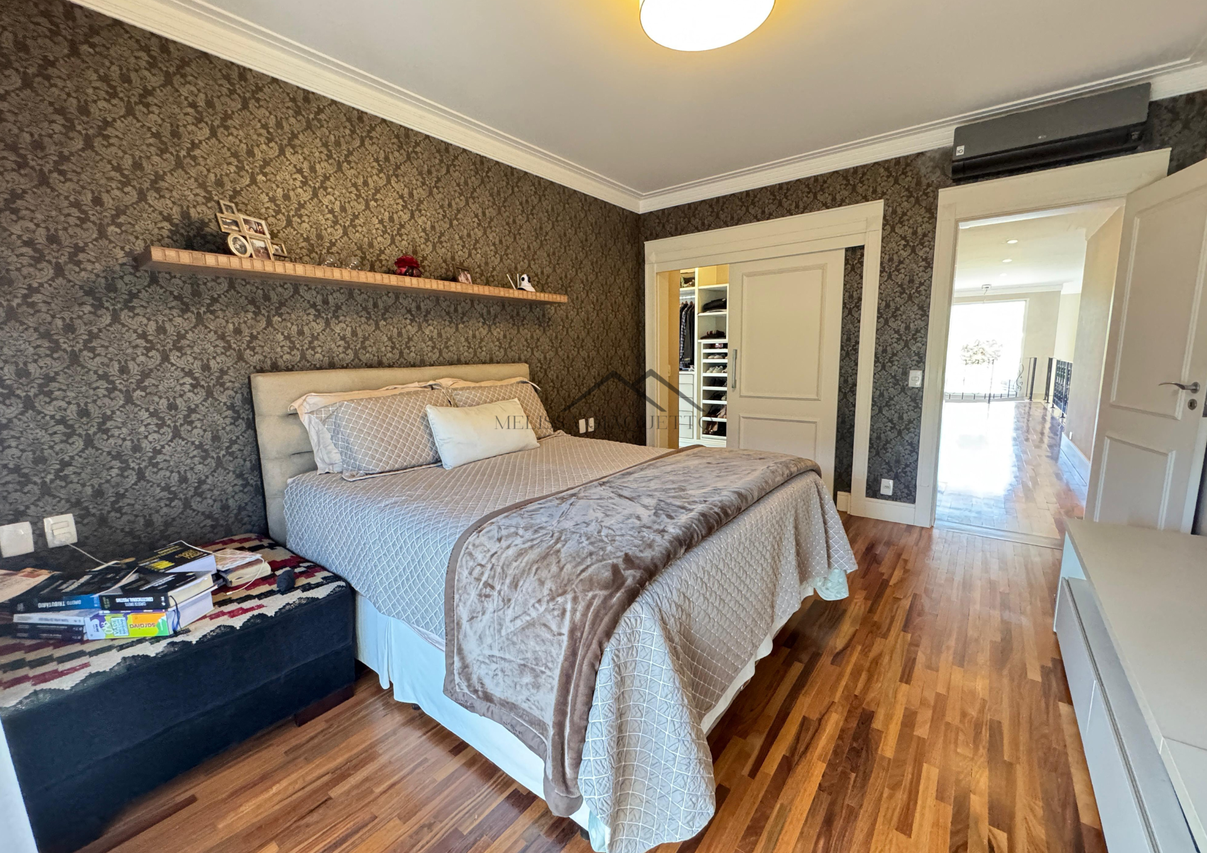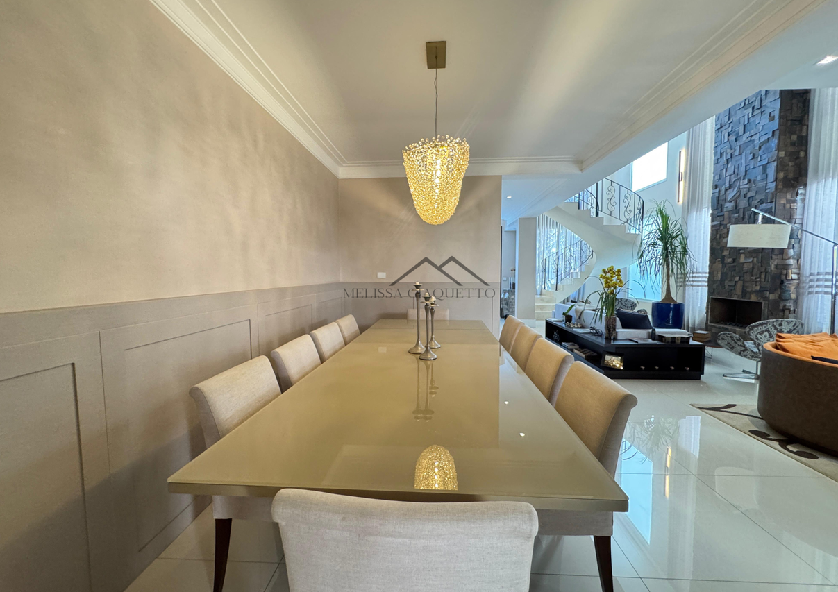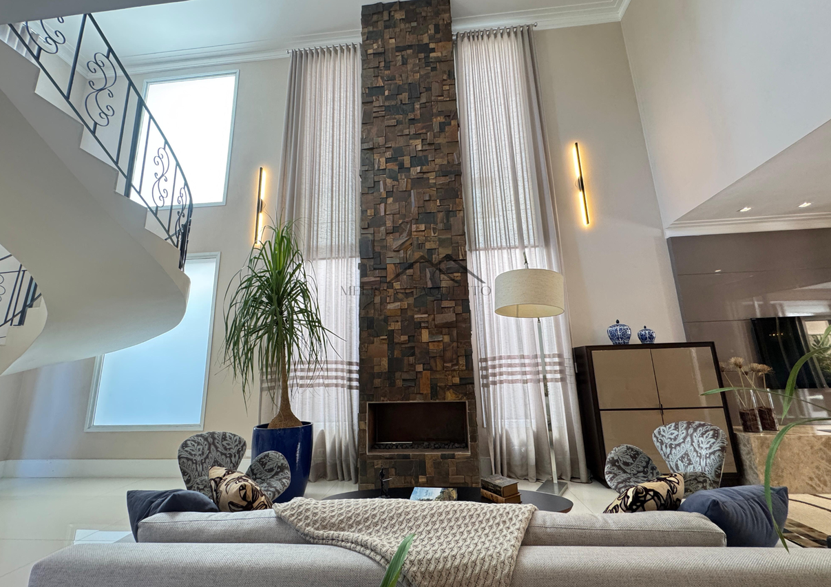 No pavimento superior, estão 3 suítes e um home office, com destaque para a suíte master, que dispõe de closet espaçoso e bem planejado. No térreo, o living com pé-direito duplo integra-se a dois ambientes de lareira, sala de jantar para 8 pessoas, lavabo e escritório com marcenaria assinada pela ID Móveis.