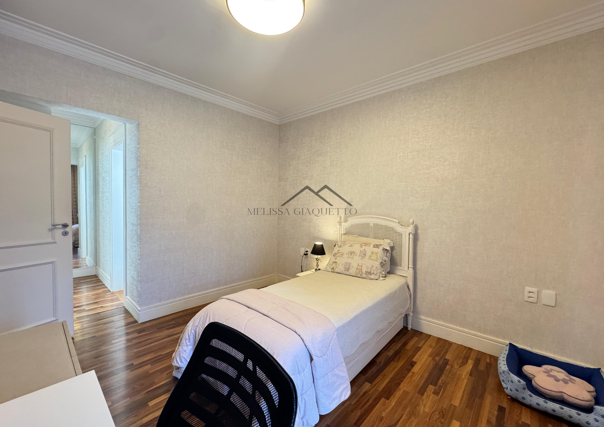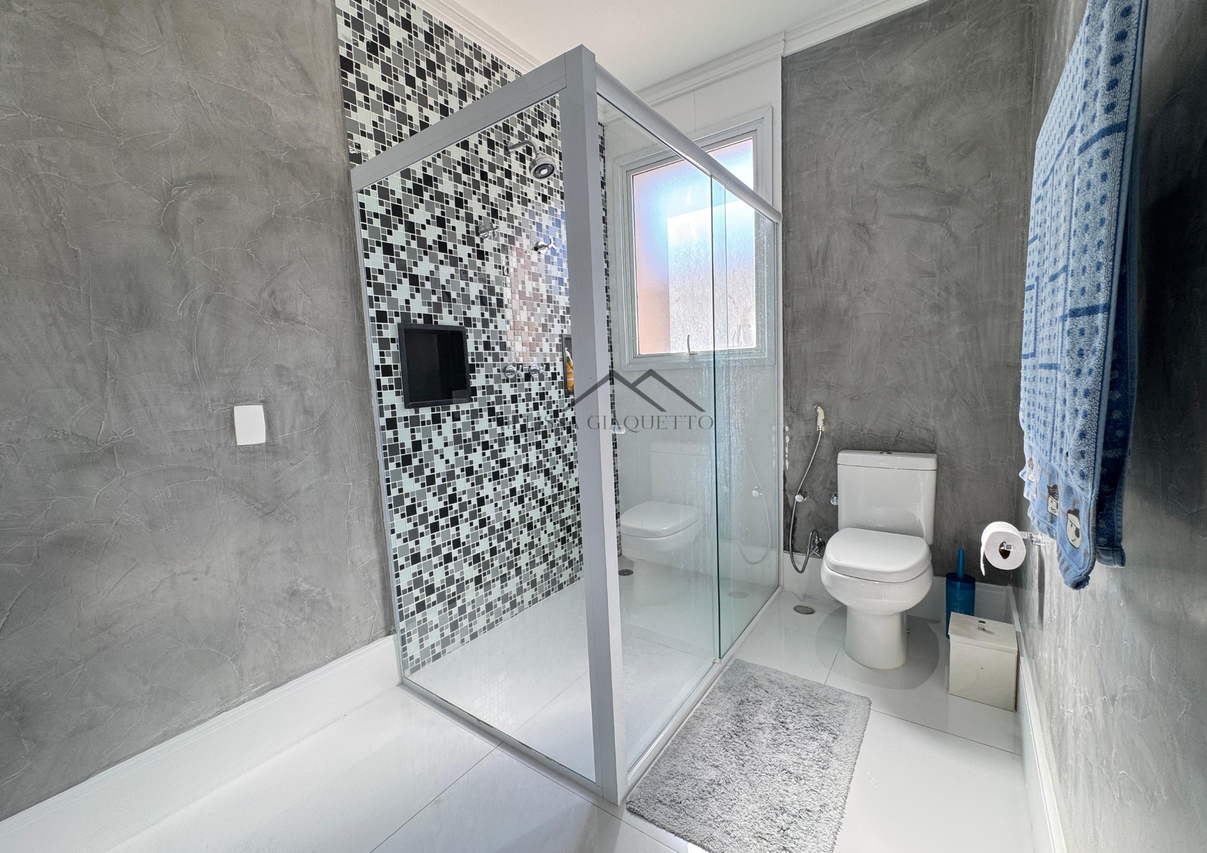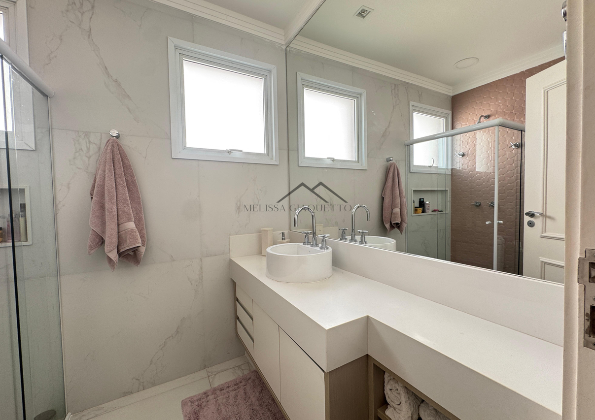 No pavimento superior, estão 3 suítes e um home office, com destaque para a suíte master, que dispõe de closet espaçoso e bem planejado. No térreo, o living com pé-direito duplo integra-se a dois ambientes de lareira, sala de jantar para 8 pessoas, lavabo e escritório com marcenaria assinada pela ID Móveis.